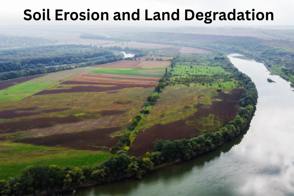 Soil erosion happens when wind or water carries away topsoil. It usually occurs on land without plants. Loss of topsoil reduces nutrients and lowers crop yields. Land degradation also includes pollution, salinity, and desertification.